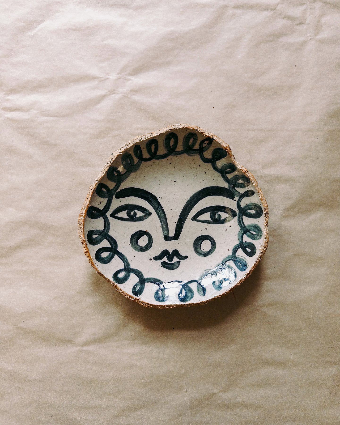 Face plate made from coarse stoneware clay, shaped and painted by hand by Karolina. The surface keeps the marks of the clay body and the hand-building process.