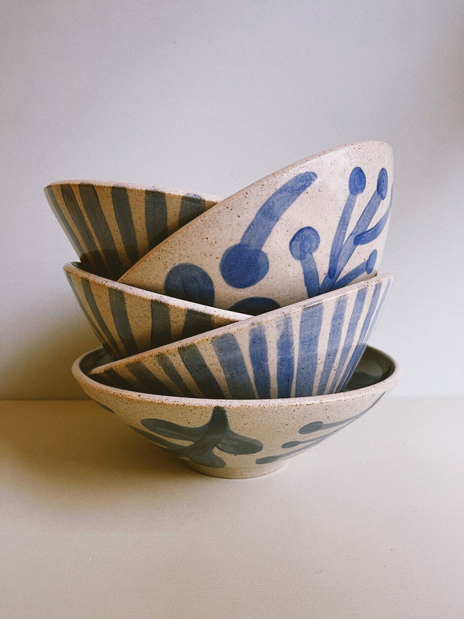 Wheel-thrown from stoneware, hand-painted by Karolina and finished inside with a transparent glaze for freshly picked flowers or wooden kitchen spoons. Use it as you like. High-fired in a gas or an electric kiln.